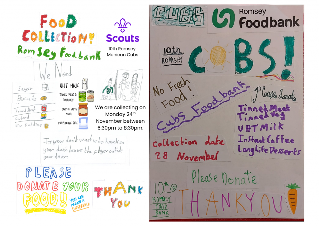 As part of their Community Impact Badge and working towards their Chief Scout’s Silver Award, the Cubs got involved right from the very beginning. Working in their Sixes, they researched the items most needed by Romsey Food Bank and used this information to design eye-catching posters to encourage local residents to donate food. The Cubs put a tremendous amount of thought and creativity into their designs, which were then combined into a final poster.
